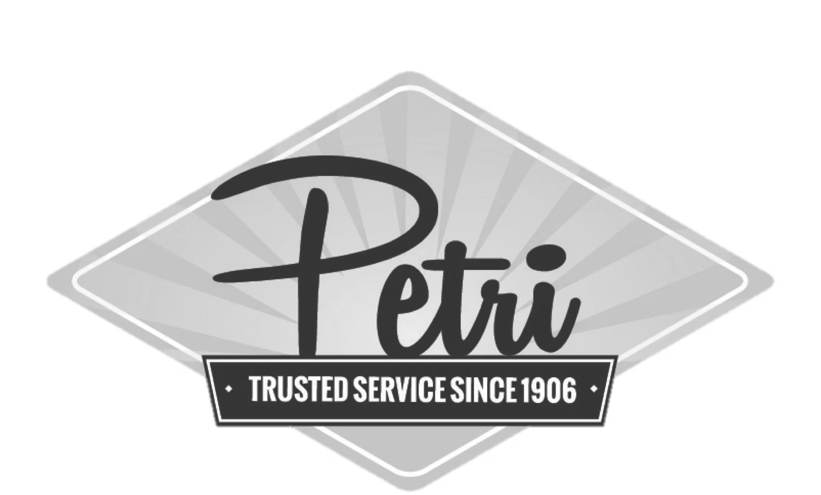 A logo featuring the word 'Petrì' in a cursive script over a diamond-shaped background with radiating lines. Below, a black ribbon with white text states 'Trusted Service Since 1906'.