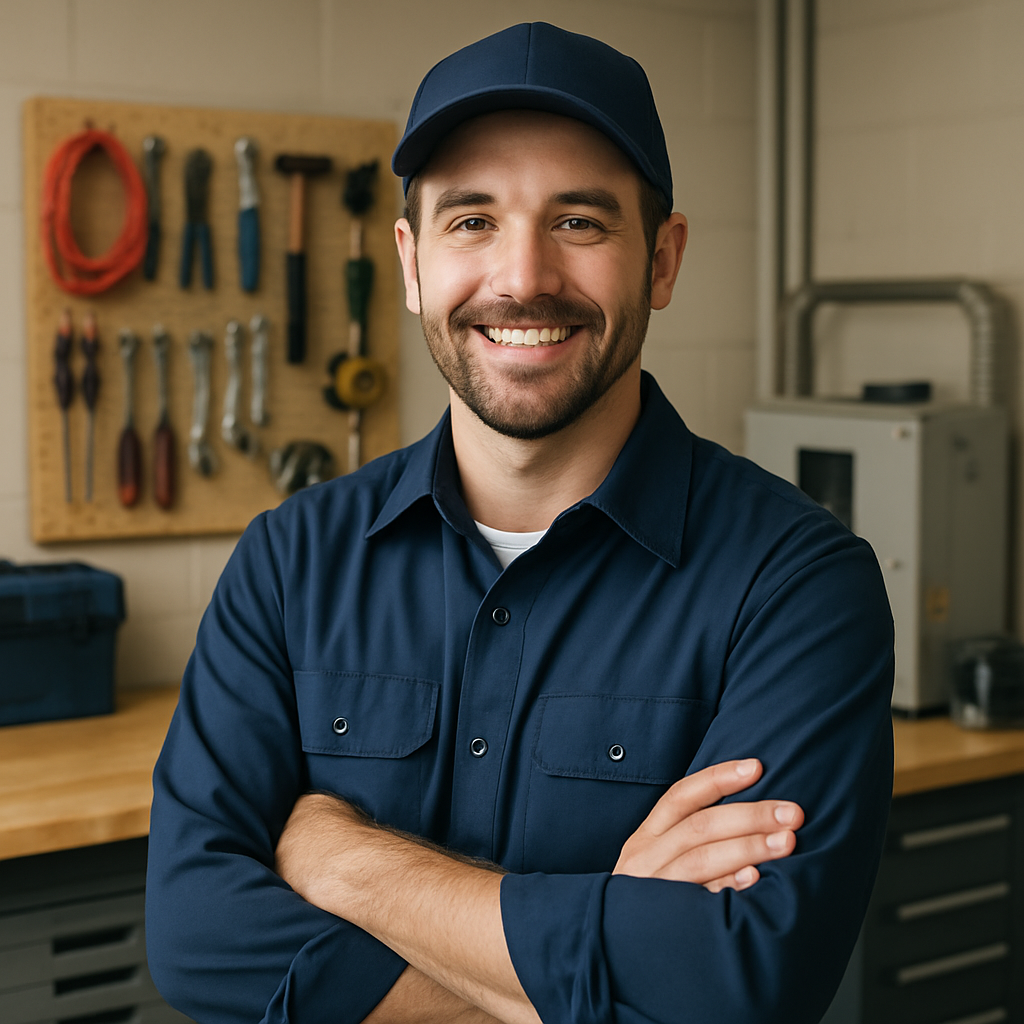• A smiling man wearing a navy blue work shirt and cap standing with arms crossed in a workshop with tools hanging on a pegboard in the background.