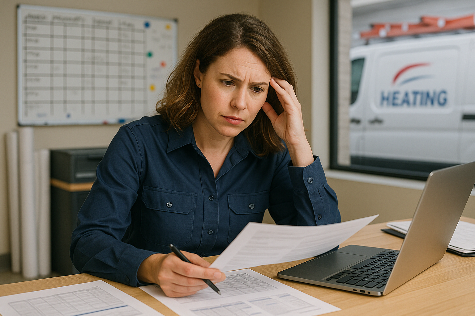 • A woman sitting at a desk, holding a sheet of paper and a pen, looking stressed while working on documents and using a laptop, with a heating company's van visible outside the window.