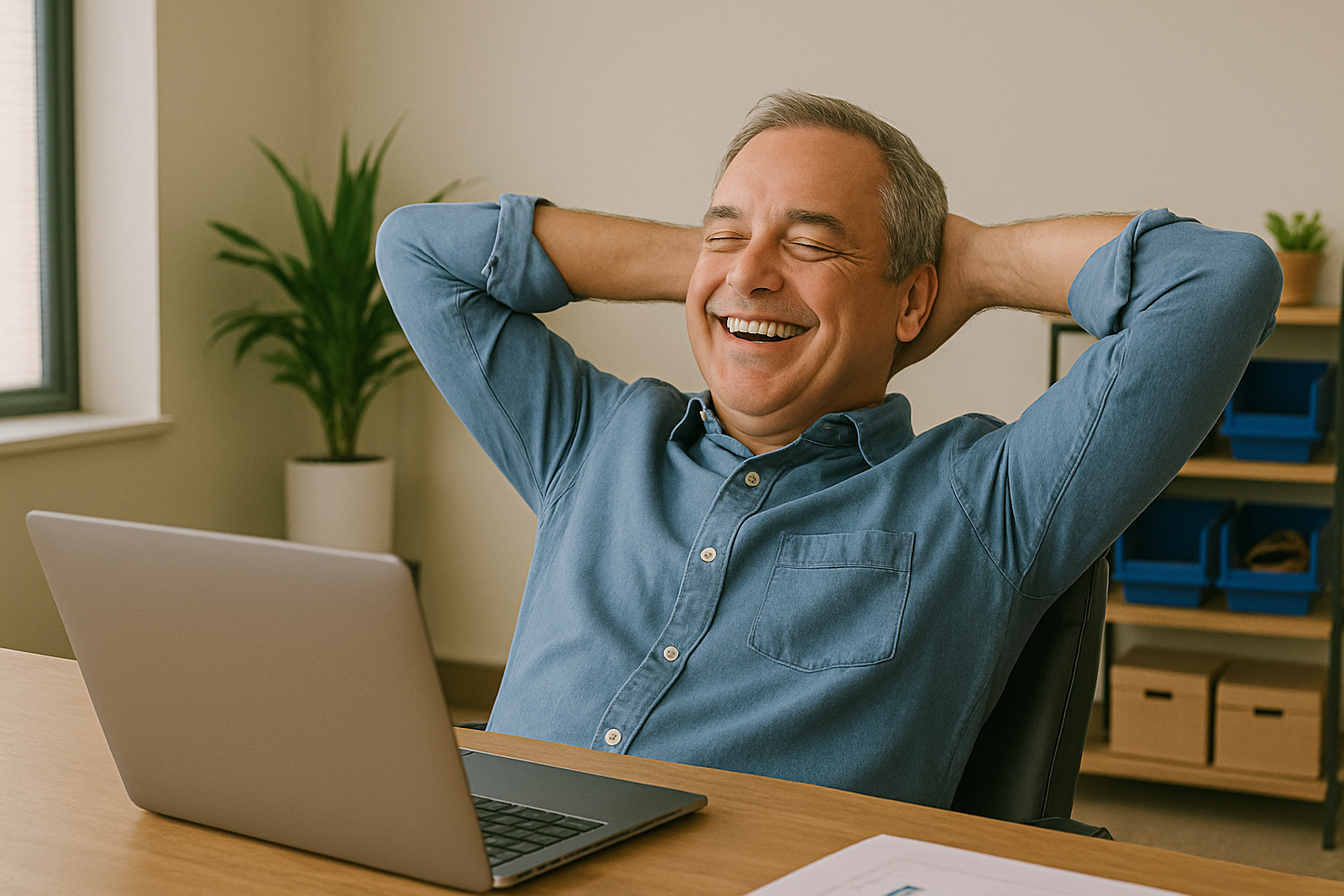 A middle-aged man sitting at a desk, smiling with eyes closed and hands behind his head, next to a laptop.